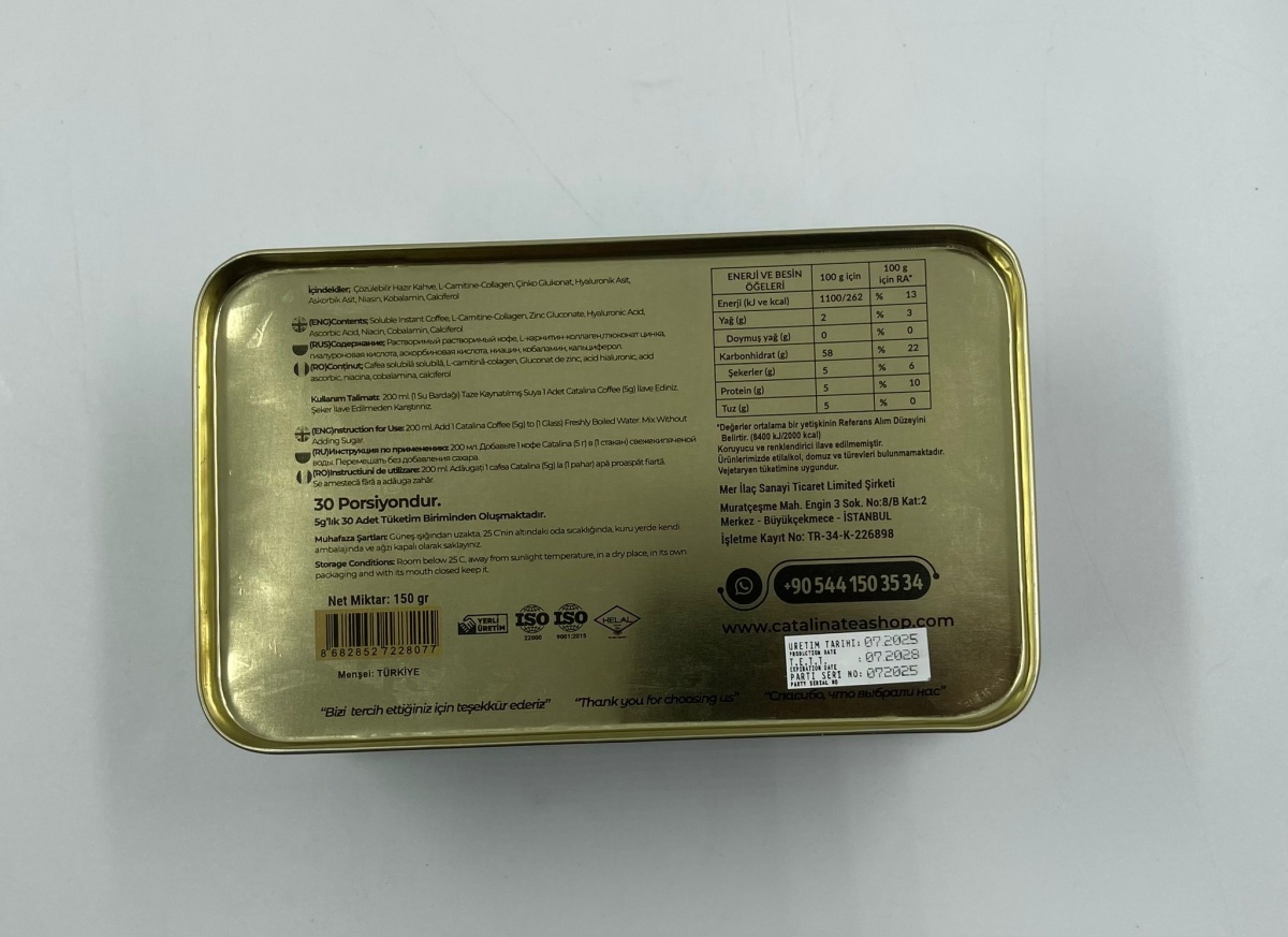 Inhaltsstoffe: Löslicher Instantkaffee, L-Carnitin, Kollagen, Zinkgluconat, Hyaluronsäure, Ascorbinsäure (Vitamin C), Niacin (Vitamin B3), Cobalamin (Vitamin B12), Calciferol (Vitamin D).